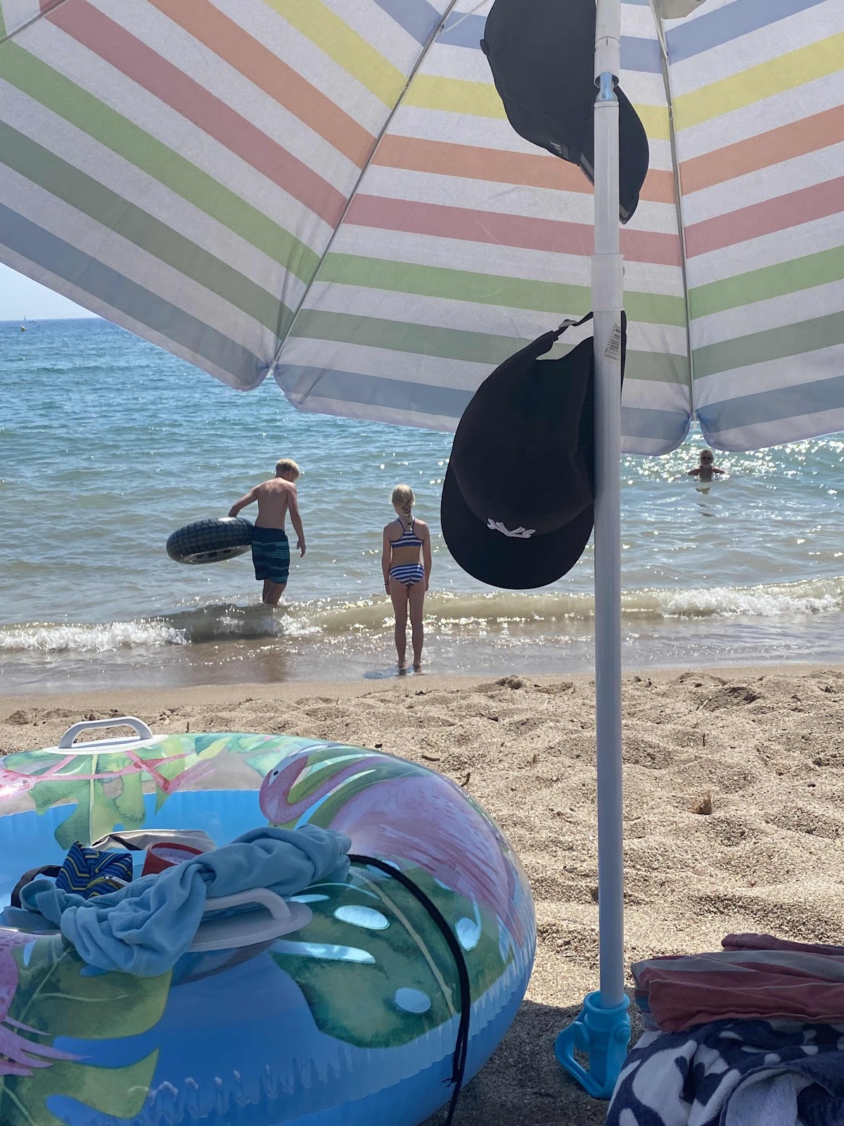 Met onze Navette mogen we nu wel naar het strand. Met met onze nieuwe strandparasol en matjes is het goed toeven op het rustige strand. Geen volle standtentjes en verhuur van allerlei waterattributen maar heerlijk rustig. Met bal en opblaasband